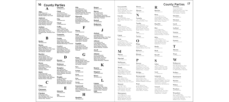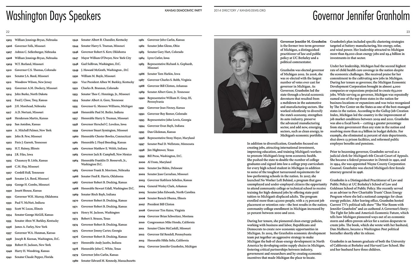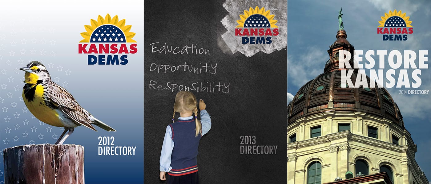 Each year, the Kansas Dems produce an expansive directory; printed copies are distributed across the state and electronic copies are available through their website. Starting in 2012, I redesigned the layout of the internal pages and designed the directory cover.